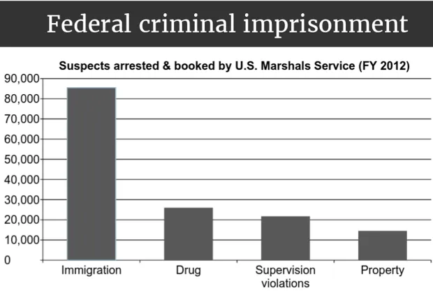 在1992年至2012年间,联邦法院判刑的罪犯数量增加了两倍多,从36,564起案件上升到75,867起。同时,非法重新入境的定罪数量增加了28倍,从1992年的690起案件增加到2012年的19,463起。仅**非法重新入境的定罪数量就占据了近一半(48%)**的联邦法院判刑罪犯总数增长。