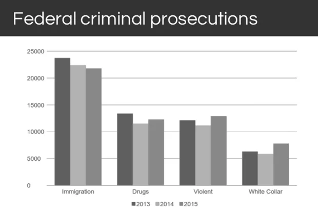 与移民相关的犯罪起诉——主要是指在没有文件的情况下进入该国或在被驱逐后非法重新入境——在1980年代开始逐渐上升。自1990年代以来,此类犯罪的定罪数量激增。通过 皮尤研究中心(强调已添加):