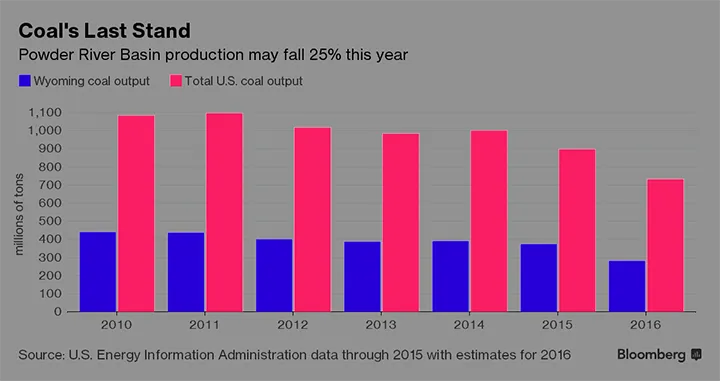 在过去五年中,摧毁阿巴拉契亚的经济崩溃终于到达了牛仔国家的粉河盆地。在过去的四十年里,从怀俄明州北延至蒙大拿州的300英里走廊,依靠其广阔平原上开采的低硫煤炭而繁荣。现在不再如此。