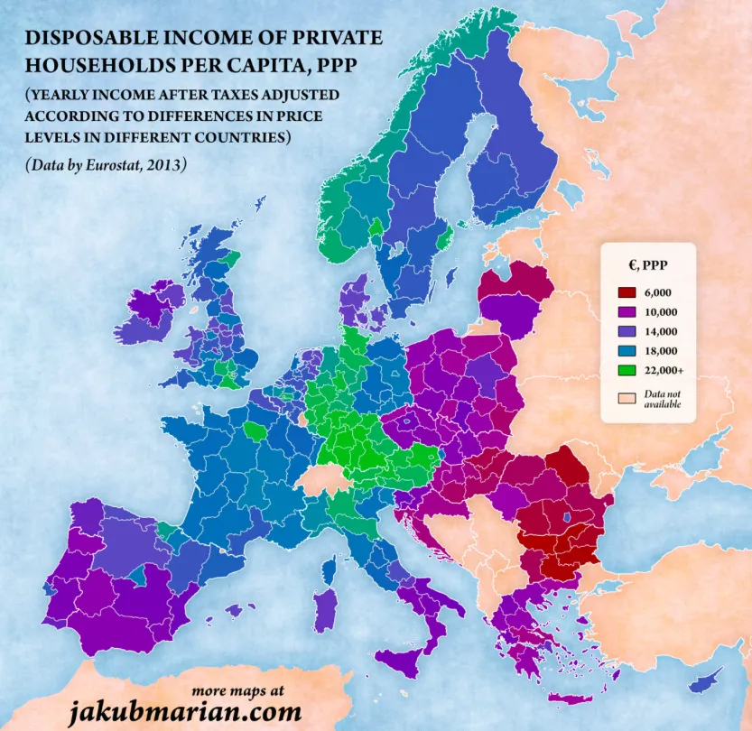 彭博社城市实验室新泽西到纽约的通勤因火车电线问题和公交延误而受到影响经历了创纪录的炎热夏季后,空调强制规定的压力加大研究发现,城市地区的降雨量比乡村边缘地区更多芝加哥在赤字超过10亿美元的情况下暂停招聘,直到2025年本月,由制图师 雅库布·玛丽安 发布的新地图提供了更为平衡的印象。它通过使用一种名为 购买力标准 的人工货币单位来呈现数据,该单位是欧盟出于统计目的而创建的。这一指标调整了价格差异,使得一个理论单位的购买力标准可以在整个大陆购买相同数量的商品或服务。以下结果显示,人工货币转换回欧元,以创建一个显著不同的图景,调整以显示欧洲的购买力平价(PPP)。