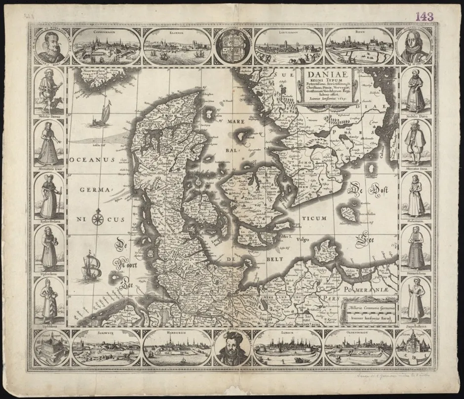 “Daniae Regni Typum Potentissimo Invictissimoque,”1629。这张描绘丹麦的地图,哈姆雷特的故事发生在这里,通过不同服装的男女图画展示了该国的不同社会群体。诺曼·B·莱文索尔地图中心