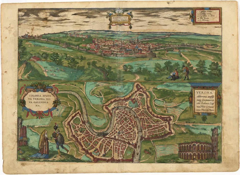 “Magnifica Illa Civitas Verona; Colonia Augusta Verona Nova Gallieniana,”1572。《罗密欧与朱丽叶》的故事发生在意大利的维罗纳。诺曼·B·莱文索尔地图中心