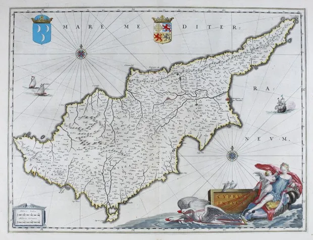 “塞浦路斯岛,” 1650年。诺曼·B·莱文塔尔地图中心西尔和她的团队想要展示一个广泛的收藏。他们选择了能够帮助说明地方特征的地图,并且与地理在情节中具有重要意义的剧作相关。例如,包括一张1650年的塞浦路斯地图,许多威尼斯人和土耳其人之间的战斗发生在奥赛罗中。塞浦路斯象征着战争与爱情在剧中交织的方式。那个前哨基地当时以其野蛮和好战的特性而闻名,同时也是爱神维纳斯的出生地。并非巧合,塞浦路斯在剧中主角妻子德斯德莫娜的陨落中扮演了重要角色,她被指控为性不忠。