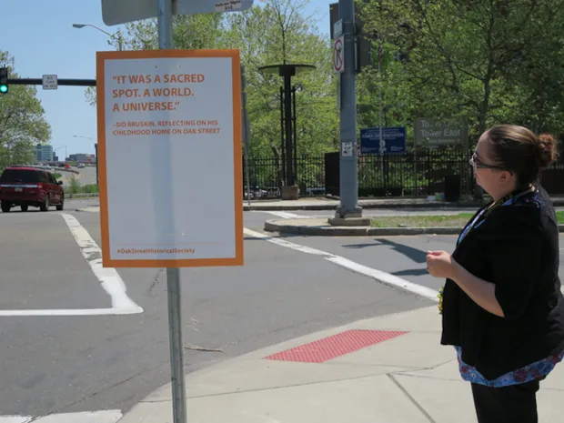 埃利胡·鲁宾或者,正如鲁宾所说,市中心交叉口是橡树街的“21世纪改造”。连接道两旁是十六个橙色和白色的指示牌,全部使用大写字母,并标有标签#OakStreetHistoricalSociety。由鲁宾的学生开发,这些标志提供了历史信息和当地人的引用。一块标志引用了一位前橡树街居民对他童年家园的描述:“这是一个神圣的地方。一个世界。一个宇宙。”另一块标志告知路过的人一个统计数据:“在1956年至1974年间,五分之一的新哈芬居民被迫迁移。”