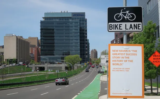 在一个晴朗的日子里,离开纽黑文市中心时,你可以穿过连接线,看到南方的长岛海湾和马塞尔·布劳尔的 皮雷利大楼。向北是100大学街的阿莱克西昂大楼的闪亮蓝色玻璃,这是市中心交叉项目的核心。该项目包括交通减速措施,如在以前快速的连接线进出口处设置专用自行车道。它还承诺提供咖啡馆和街道零售,减少汽车交通,进一步的房地产开发,以及额外的公共空间,包括小型公园。