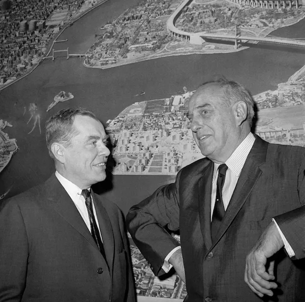 罗伯特·摩西,右,和当时的新哈芬市市长理查德·李,1958年3月4日。美联社照片/约翰·鲁尼李和其他人利用对橡树街社区的感知衰败来合法化他担任市长期间橡树街的拆除。埃利胡的标识项目融入了这些言辞。例如,有一个将该社区比作“苹果上的腐烂点”。最终,尽管居民抗议和抵制,42英亩的土地在 伯曼诉帕克 案件下被征用,这是1954年最高法院的案件,扩展了征用权的原则,包括为了模糊定义的“公共安全、公共健康、道德、安宁和法律秩序”而征用土地和私人财产。橡树街随后在1956年联邦公路法案下被夷为平地。