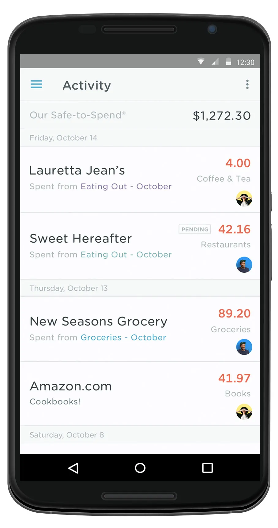 您在自己账户中的所有操作都是私密的,而您们共享账户中的所有活动对你们双方都是可见的。您可以在手机上实时接收共享账户的消费通知。这样,您可以实时跟踪伴侣的动向,无论是财务方面还是其他方面。例如,如果您的男朋友晚上在杂货店停留,您将知道他买了多少东西,甚至到分。您还会知道他可能很快就会回家。