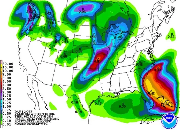 几乎可以肯定的一件事是,东南部将会是一个湿透的时光。佛罗里达州海岸的降雨量在三天内可能超过14英寸,如气象预报中心的降水预测所示: