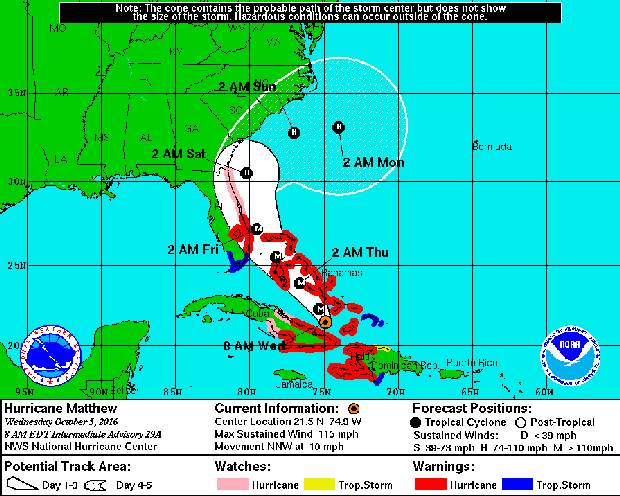 周二晚上,暴风雨以 四级风暴强度冲击古巴,进行第二次登陆。从那里,马修将转向巴哈马和美国,周四和周五将给东南部居民带来有趣的局面。南佛罗里达州的 飓风观察警告生命和财产面临“高”危险,预计“74到110英里每小时”的飓风强风,可能造成屋顶和树木损坏,且气候“对龙卷风有些有利”。