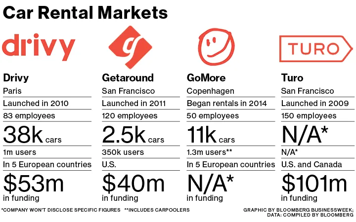 Drivy于2010年底在法国推出,现在还在奥地利、比利时、德国和西班牙运营。创始人兼首席执行官保林·德门通表示,它列出了大约38,000辆可租赁的汽车,并拥有100万注册用户。GoMore在丹麦、法国、挪威、瑞典和西班牙运营——去年收购了Amovens——并根据联合创始人兼首席执行官马蒂亚斯·达尔斯高德的说法,列出了大约11,000辆汽车。这些服务表示,他们的收费平均显著低于传统汽车租赁机构的收费。