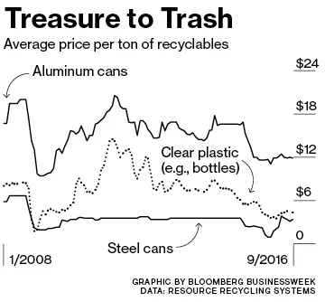 废料价格下降得更厉害。根据位于密歇根州安阿伯的咨询公司资源回收系统的数据,截至九月份,一吨分类铝罐的价格为11.88美元,比两年前下降了28%。一吨塑料瓶的价格为4.25美元,自2014年以来下降了44%。较低的油价也降低了回收塑料的价值,因为制造新塑料的成本比以前便宜,在某些情况下,购买回收材料的成本甚至更高。