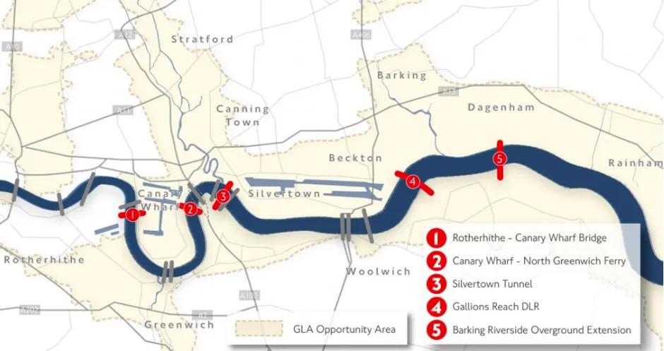 伦敦计划中的河流交叉点地图。链接一、三和四刚刚获得市长批准,而链接二和五仍在考虑中伦敦市长东伦敦多年来一直在呼吁新的泰晤士河跨越点。本周,市长西迪克·汗弥补了失去的时间——他批准了三个:一个供行人和骑自行车的人使用的桥梁、一条跨河轻轨连接线和一条主要的公路隧道。希望它们能缓解交通拥堵,更好地连接一个经历了伦敦一些最激烈发展的地区。