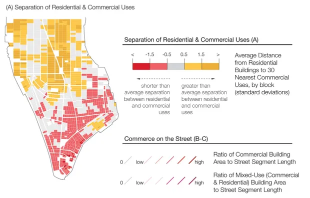 Baics 和 Meisterlin有趣的是,根据研究的街道层面分析,曼哈顿中城的商业活动远不如上曼哈顿第三大道和第八大道之间的商业活动。这有两个原因:一方面,商业活动沿着这两条大道跟随早期的公共交通——以公共汽车线路的形式。另一方面,由于私人限制仅允许住宅开发,关键大道上的商业开发被禁止。这是一种“规划之前的规划”(正如研究所说),或早期的NIMBY主义,使富裕居民能够控制他们社区的发展方式。