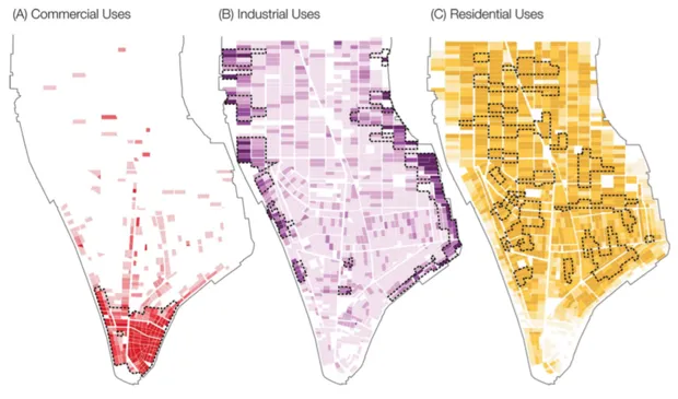 一项 最近的研究来自巴纳德学院的Gergely Baics和Leah Meisterlin,详细探讨了19世纪中期曼哈顿快速变化的土地使用模式——在其臭名昭著的网格布局之后,但在现代分区开始之前。该研究特别引人注目的是 其使用GIS和其他现代分析技术来检查来自纽约公共图书馆广泛藏品的档案——具体来说,是Perris火灾保险地图——涵盖了1850年代早期超过60,000栋住宅、商业和工业建筑。