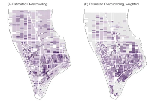 Baics 和 Meisterlin考虑到如此高的密度,当时一个主要的担忧是过度拥挤,尤其是在贫困居民中。看看下面的两张地图,深紫色表示高水平的过度拥挤。第一张地图提供了一个总体情况,而第二张地图则按人口密度加权。过度拥挤的最高水平出现在下东区,反映了其移民工人阶级社区的公寓住房。当时,这些公寓楼的住宅密度比更北部的社区高出五到六倍。尽管如此,地图显示出城市各处都有过度拥挤和公寓住房的区域,甚至在豪华住宅区周围也存在。