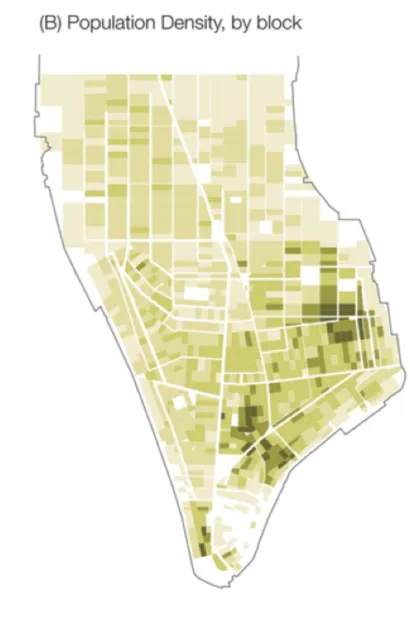 总的来说,20世纪中叶的曼哈顿是一个非常密集的地方,如下图所示。最高的密度(用深绿色阴影表示)位于下曼哈顿的工人阶级区域,特别是下东区,这里居住着城市日益增长的移民劳动力。事实上,这些地区的居民人数是今天的两到三倍。华盛顿广场以北的更富裕住宅区,第三大道和第六大道之间的密度则明显较低。