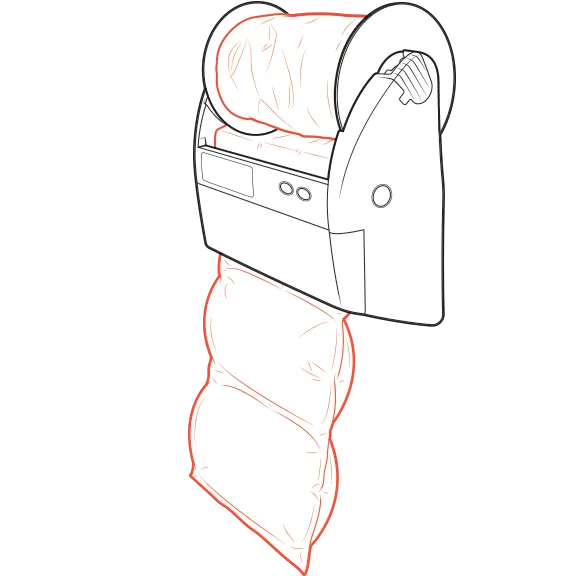 充气13x14x8英寸的Fill-Air Flow挂在墙上,将10x8英寸的塑料袋卷送入机器的充气器。用户可以通过设备前面的按钮自定义所需的充气量。