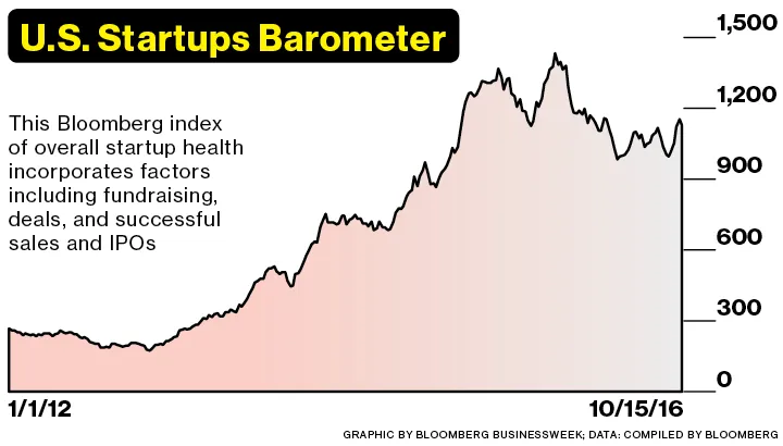 这意味着企业家在短期内的机会更少。彭博社美国初创企业晴雨表——一个考虑融资金额、交易数量、首次融资和成功收购或首次公开募股的指数——在历史标准上仍然很高,但自2015年11月以来下降了21%。
