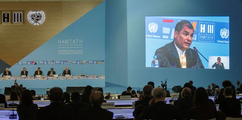 厄瓜多尔总统拉斐尔·科雷亚在基多的联合国人居大会开幕式上发言时被拍摄在屏幕上。吉列尔莫·格兰哈/路透社基多——联合国全球城市峰会,人居三号,在安第斯阳光下的漫长安检队伍中开始,并以歌曲结束。音乐团体尼克·霍纳家庭在吸引了约40,000名参与者的会议最后一天演唱了《梦想之城》。在此之前一个多小时,新城市议程——一份旨在指导全球城市未来发展的宣言——正式通过。
