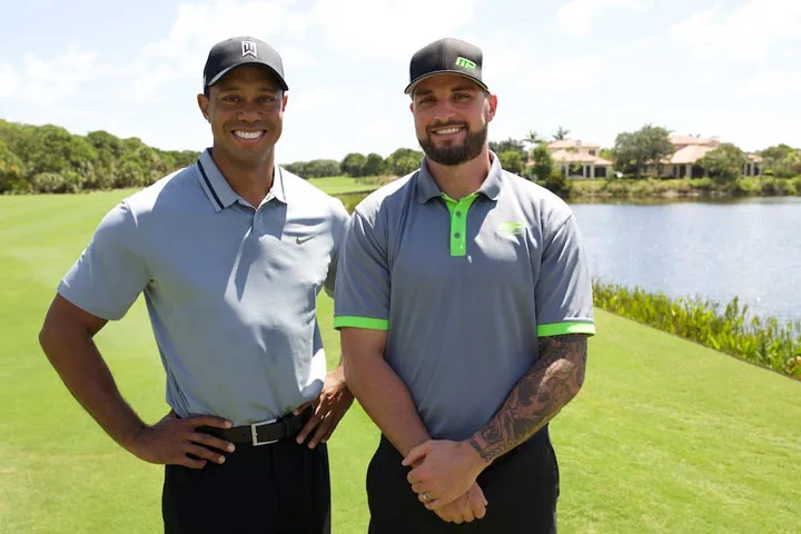 Pyatt与伍兹合影,伍兹为在他的高尔夫球包上放置MusclePharm的标志而获得了数百万的报酬。