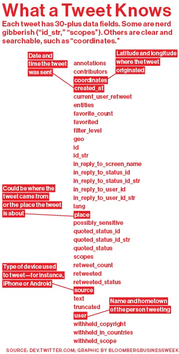 也就是说,除非你可以访问Twitter的第二部分:Firehose,它至今已经发布了近一万亿条推文。每条推文都包含了从主页蓝色框中发布的文字——这是大多数人想到推文时的印象——以及超过30个大多数普通用户看不到的其他数据字段。通过这些数据,用户可以按多种方式进行排序,包括他们发布推文所用的设备、他们在个人资料中提供的姓名和位置,以及推文被转发的次数。如果用户同意,数据还可以包括推文发送的确切位置,这种做法被称为地理标记。在Firehose中,消息文本仅占数据的3%。加州大学伯克利分校的研究员杰拉尔德·弗里德兰说,其余的“基本上是关于你的信息。”