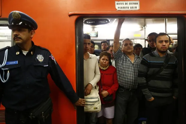 人们站在墨西哥城拥挤的地铁车厢内埃德加德·加尔迪奥/路透社