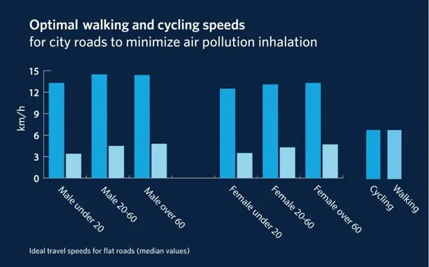 根据不列颠哥伦比亚大学的亚历山大·比加齐的说法,这些是20到60岁的人在平坦城市道路上移动的“最佳速度”。比加齐在土木工程系和社区与区域规划学院工作,他计算这些速度是为了减少人们对空气污染的暴露。“你移动得越快,”他在一份新闻稿中说,“你呼吸得越急,可能吸入的污染物就越多,但你暴露在交通中的时间也会更短。”