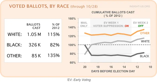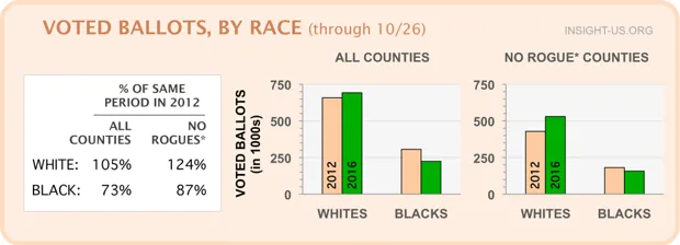 insightus这些“微妙的选民压制”效应之一可以在大约十几个县中找到,这些县在提前投票的第一周(10月20日至27日)决定仅提供一个投票地点。这些县的投票率,布萨称之为“流氓,”远低于2012年提前投票第一周的投票数据。例如,吉尔福德县在2012年有16个投票地点;上周只有一个**.**该州十个最大县中,拥有最大非裔美国人群体的四个县,均选择在提前投票的第一周仅开放一个投票地点。而所有这些“流氓”县的投票率都很低。