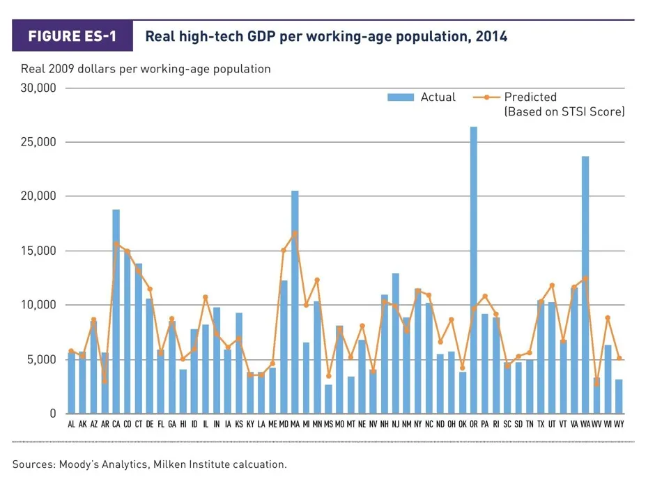 泰勒·布莱克研究发现,一个州的技术和科学能力(通过STSI衡量)与该州的经济成功之间存在密切关联。下面的图表显示了50个州的人均高科技经济产出与STSI指数之间的关联。报告指出,整体而言,STSI预测了约75%的实际高科技人均GDP的差异。一旦研究排除了俄勒冈州和华盛顿州的异常值影响,这两个州的科技经济主要由两家公司,英特尔和微软驱动,解释力接近90%。