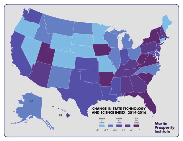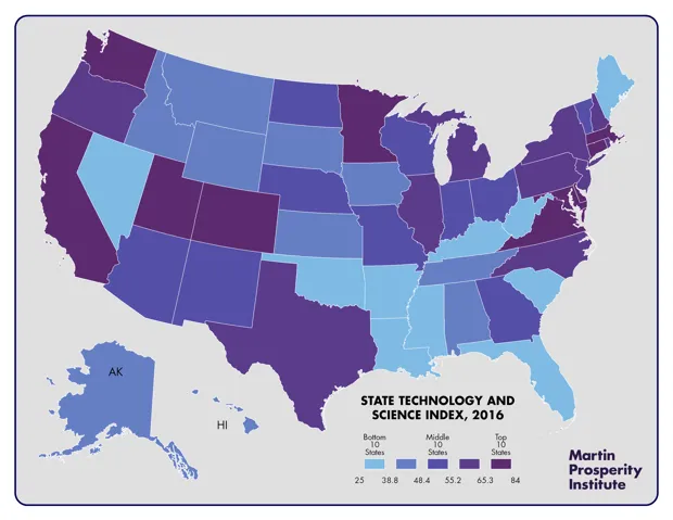 一份新的报告,州技术与科学指数,来自罗斯·德沃尔及其在米尔肯研究所的同事,揭示了美国领先州与落后州之间的巨大差距,对所有50个州进行了排名,基于更新的州技术与科学指数(STSI),该指数基于涵盖五个广泛类别的数十个指标:研究与开发、创业与风险资本、人力资本、科学与技术劳动力,以及高科技产业的集中度和活力。