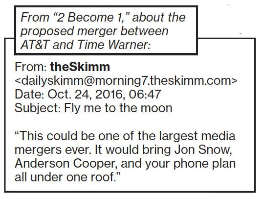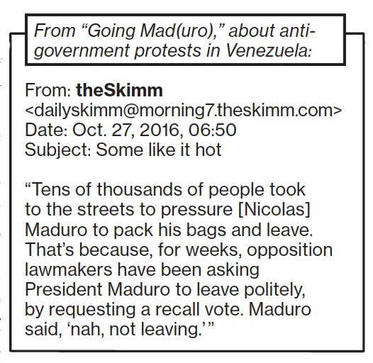 彭博社商业周刊不是囚犯。寻求庇护者占据了拜登承诺关闭的监狱美国正在用寻求庇护者填满臭名昭著的前监狱大学橄榄球需要向大联盟棒球学习一课那些销售比职业选手更多棒球棒的网红兄弟们将Skimm视为亨利·卢斯原版时代杂志的千禧一代友好更新可能会有所帮助,它将认真全面的新闻报道与内部笑话结合在一起。正如名字所暗示的,Skimm不会满足任何深刻的知识好奇心;不过,它会帮助你在鸡尾酒会上避免显得无知。每次推送包含关于政治、商业、文化以及有时体育(在“球”标题下)的新闻摘要和链接。这是一种怀旧,尤其是在新媒体平台如BuzzFeed根据兴趣或身份为读者量身定制内容,希望其在Facebook和Twitter上病毒式传播的时代。Skimm有一个网站和一个Facebook页面,但绝大多数读者以电子邮件的形式消费它。没有定制。没有热门观点。