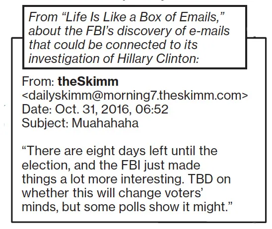 在Skimm,每天早上向超过400万年轻专业人士的收件箱发送名为每日Skimm的通讯,辩论也是主要事件。但Skimm的报道语气则显得不那么正式:“特朗普和希尔兹在拉斯维加斯度过了一个晚上,”摘要开始道。在Skimm的术语中,“希尔兹”指的是希拉里·克林顿。唐纳德·特朗普没有绰号,尽管在2012年选举中,米特·罗姆尼被称为米特斯。