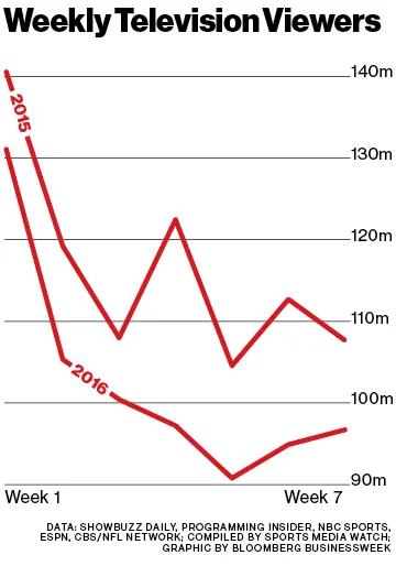 多年来,当广播、有线和卫星电视经历剧烈变化时,NFL 是个例外。全国最大媒体公司的高管们可以通过指向联盟的稳定实力来缓解投资者的焦虑。随着真人秀节目失利, 美国偶像 崩溃,Netflix、亚马逊和 YouTube 开始分散观众对网络电视的注意力,足球却不断吸引他们回来。即使在最近的低迷中,足球比赛仍然是电视上收视率最高的节目之一,但对某些人来说,这只会让下降更加令人沮丧。