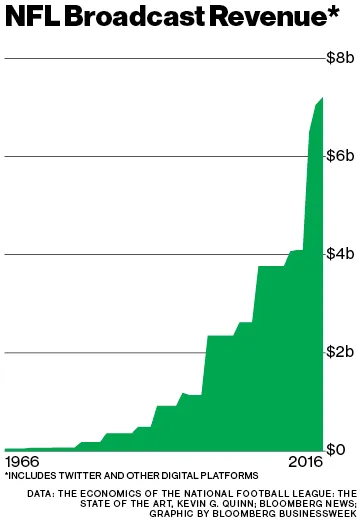 照片插图:731;Getty Images (3) 就像小丑鱼和海葵一样,国家橄榄球联盟和广播媒体是共生的生物,深深依赖于彼此的生存。各大网络——康卡斯特的NBC、迪士尼的ESPN、CBS和21世纪福克斯——今年共同支付NFL约52.5亿美元来播放比赛。“我告诉你为什么这很重要,”体育经纪人莱赫·斯坦伯格说。“在1976年,当我开始代表运动员时,每支球队从国家电视合同中获得几百万美元的份额。去年他们每人收到了一张226百万美元的支票。并不是每一分钱都来自国家电视收入。但大部分是。”NFL球队的数十亿美元估值、明星球员的巨额合同、球衣、纪念品和其他商品的丰厚销售——斯坦伯格说,这一切都依赖于NFL的大量电视观众。“任何威胁到它的事情,对任何参与NFL的人来说都是一个真正的担忧。”