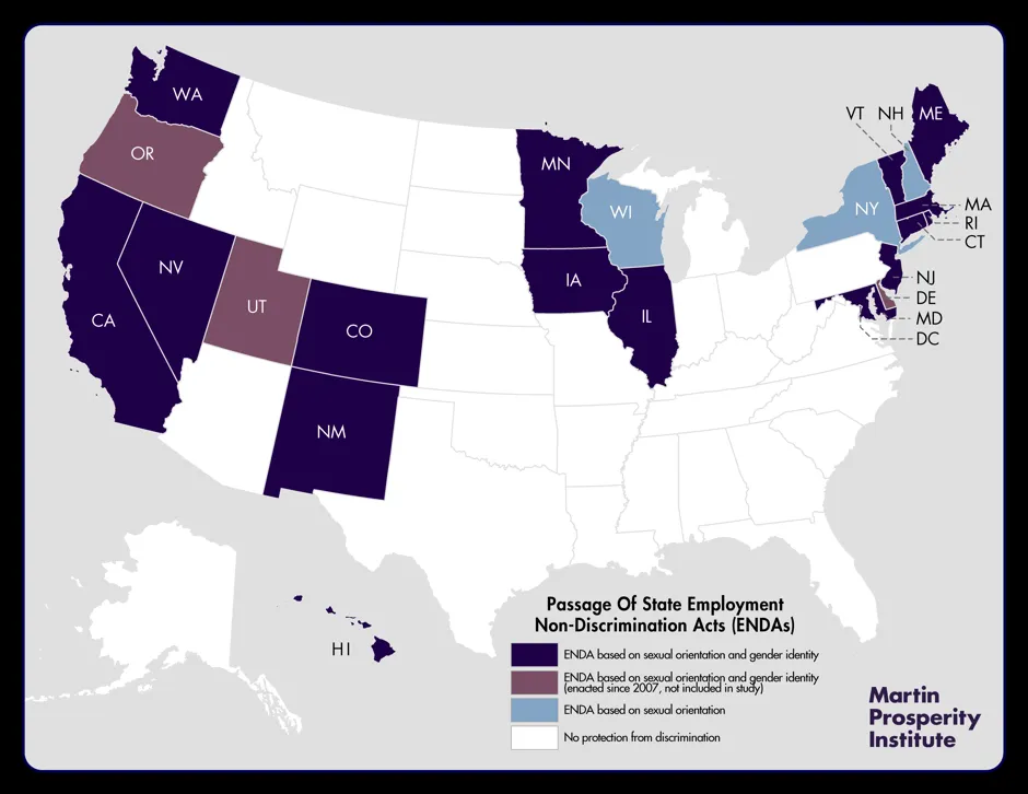 根据美国公民自由联盟(ACLU)的数据,显示了拥有各种ENDAs的州的地图。泰勒·布雷克像这样的研究中的一个大问题围绕着研究人员所称的“虚假”发现——即由其他因素引起的发现。例如,许多拥有ENDAs的州,如加利福尼亚州和马萨诸塞州,也被认为是最具创新性的州,因此,也许那里的公司本身就更具创新性,而他们的创新水平与这些州更友好于同性恋者的关系不大。该研究非常小心地排除了可能混淆这些非歧视法律影响的因素,例如州的整体经济表现和人才水平、LGBT人口的规模以及政治取向。此外,研究还仔细考察了早期与后期通过的法律的影响,甚至将拥有ENDAs的州与没有ENDAs的邻近州进行比较,以确保准确评估友好于同性恋者的州对创新的确切影响。