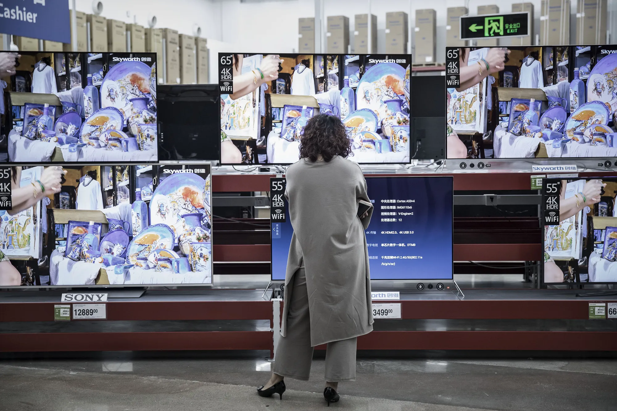 一位顾客在看平面电视。摄影师:沈奇来/彭博社根据OC&C战略咨询公司大中华区合伙人Jack Chuang的说法,山姆会员店的自有品牌,如其会员标记的私人标签燕麦片和厨房毛巾,或为沃尔玛在英国开发的Asda品牌,在其本土市场并不被视为高端品牌。但山姆会员店一直在宣传其自有品牌商品的外国来源,并以低于进口商品在中国通常售价的价格出售它们。“他们在中国所做的是利用‘进口’对中国购物者来说是高端的这一事实进行品牌重塑,”他说。