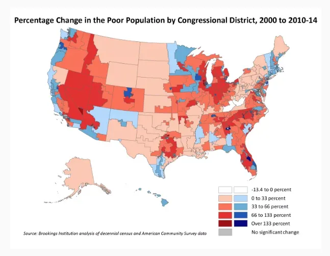 贫困人口在郊区和共和党领导的地区增加。布鲁金斯学会这些地区在分析的时间段内也推动了全国贫困人口的增长——全国增加的60%来自这些地方。民主党地区低收入居民的增长(33%)低于共和党地区(49%)。一个原因是:美国贫困人口的迁移模式正在变化,Kneebone解释道。