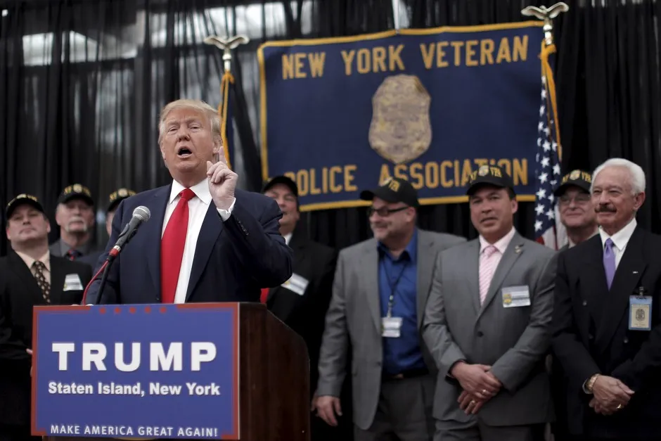 美国共和党总统候选人唐纳德·特朗普在2016年4月17日于纽约市斯塔滕岛区接受纽约退伍警察协会的支持后向媒体发表讲话。布伦丹·麦克德米德/路透社在竞选活动和辩论中,唐纳德·特朗普常常因 他对警察的辩护 而赢得喝彩,尤其是在涉及警察枪击事件的抗议之后。称警察 为“美国最受虐待的人”使当时的共和党提名人获得了主要执法组织的支持,如警察兄弟会和国家边境巡逻委员会。
