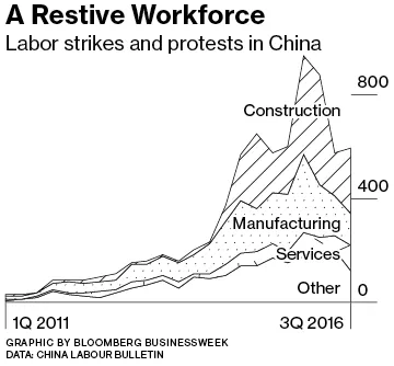 去年,中国发生了创纪录的2,774起罢工和抗议活动,是2014年数量的两倍,根据中国劳动通讯的报道。虽然包括沃尔玛员工和送餐摩托车手在内的服务行业的罢工在今年有所增加,但煤炭和钢铁工人也在抗议,因为工厂试图强制削减产能。