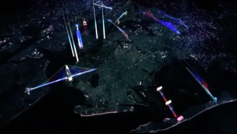 基础设施规模的华丽LED是一种新现象。飞利浦照明负责全球至少100座桥梁的照明安装,在2007年收购了波士顿的初创公司Color Kinetics,并获得了多个关于混合和调光LED以创造照明的专利。光纤和基于云的监控的新进展使得在数万个LED上编排复杂的图案成为可能——不仅仅是在单一水道上,而是在整个城市中。例如,在巴黎发生袭击后迅速将城市的颜色更改为三色旗,或庆祝骄傲游行。