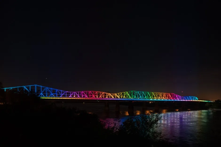 孟菲斯的大河跨越。Darius Kuzmickas/飞利浦照明也许最著名的美国桥梁之一是旧金山–奥克兰海湾大桥,它采用了华丽的照明方案。世界著名的照明艺术家维拉里尔设计了这个安装了25,000个LED灯的项目,称为“海湾之光,”该项目于2013年首次亮相。