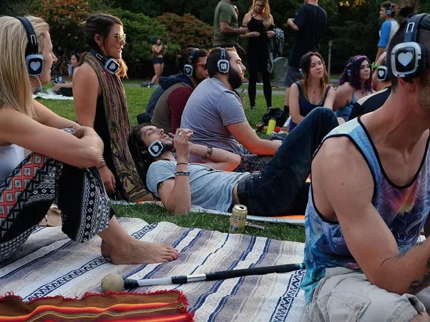 杰弗里·希勒在劳雷尔赫斯特公园的心跳静音迪斯科,人们调入自己的灵感和频率,听着现场DJ通过无线耳机传输的声音。信号传输范围不远,只有1500米的半径。有些人沉醉于舞蹈,其他人则坐在毯子上,享受现场的氛围。这是一种新的逃避方式。