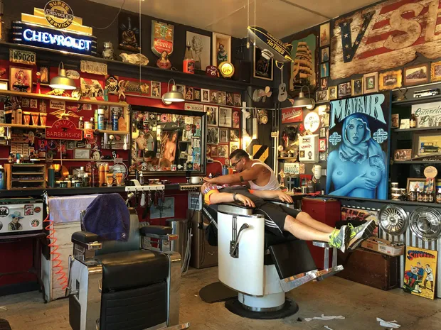 杰弗里·希勒在米尔沃基的铁砧理发店,传统得以延续。这里是一个正宗的理发店:一个男人们理发、刮胡子、闲聊、开玩笑、喝啤酒并逃离家庭的地方。没有孩子,没有女人。墙上挂满了照片、海报和奇特的物品,空气中弥漫着淡淡的理发蜡香。