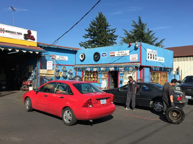 杰弗里·希勒双J轮胎位于MLK,是一家家族经营的轮胎经销商,也是当地的长期热门选择。大部分工作是在停车场进行的,汽车(和公交车)飞驰而过。