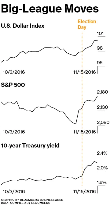 标准普尔500指数中的金融公司股票在选举后的一个星期内上涨了约11%,这可能是因为投资者相信特朗普将 dismantle 多德-弗兰克法案。工业股因对基础设施支出的期望上涨了近6%。对企业利润减税的前景也对股价有利。