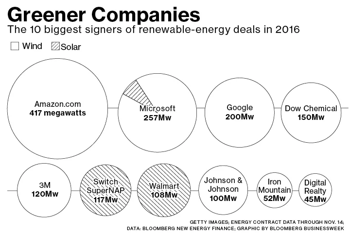 在11月4日,沃尔玛宣布了一项激进计划,承诺到2025年将一半的运营来自风能、太阳能和其他可再生能源,并在同一时期内将其运营的碳足迹减少18%。十天后,微软达成了其有史以来最大的风电采购协议,与堪萨斯州和怀俄明州的涡轮机达成协议,购买237兆瓦的电力以供在夏延的数据中心使用。