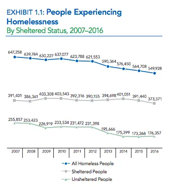 来源:HUD与 年度当前人口调查报告 关于家庭经济的情况类似,HUD报告中所有迹象都指向正确的方向。回顾奥巴马政府的两个任期,许多成果甚至更为显著。在2007年至2016年间,生活在街头、露营地或其他无庇护系统外的人数急剧下降——减少了31%。(瞬时统计确实会遗漏无家可归者,就像任何人口普查一样。但由于他们每年采用相同的方法,因此被认为是衡量无家可归对社区影响的重要和可靠的指标。)