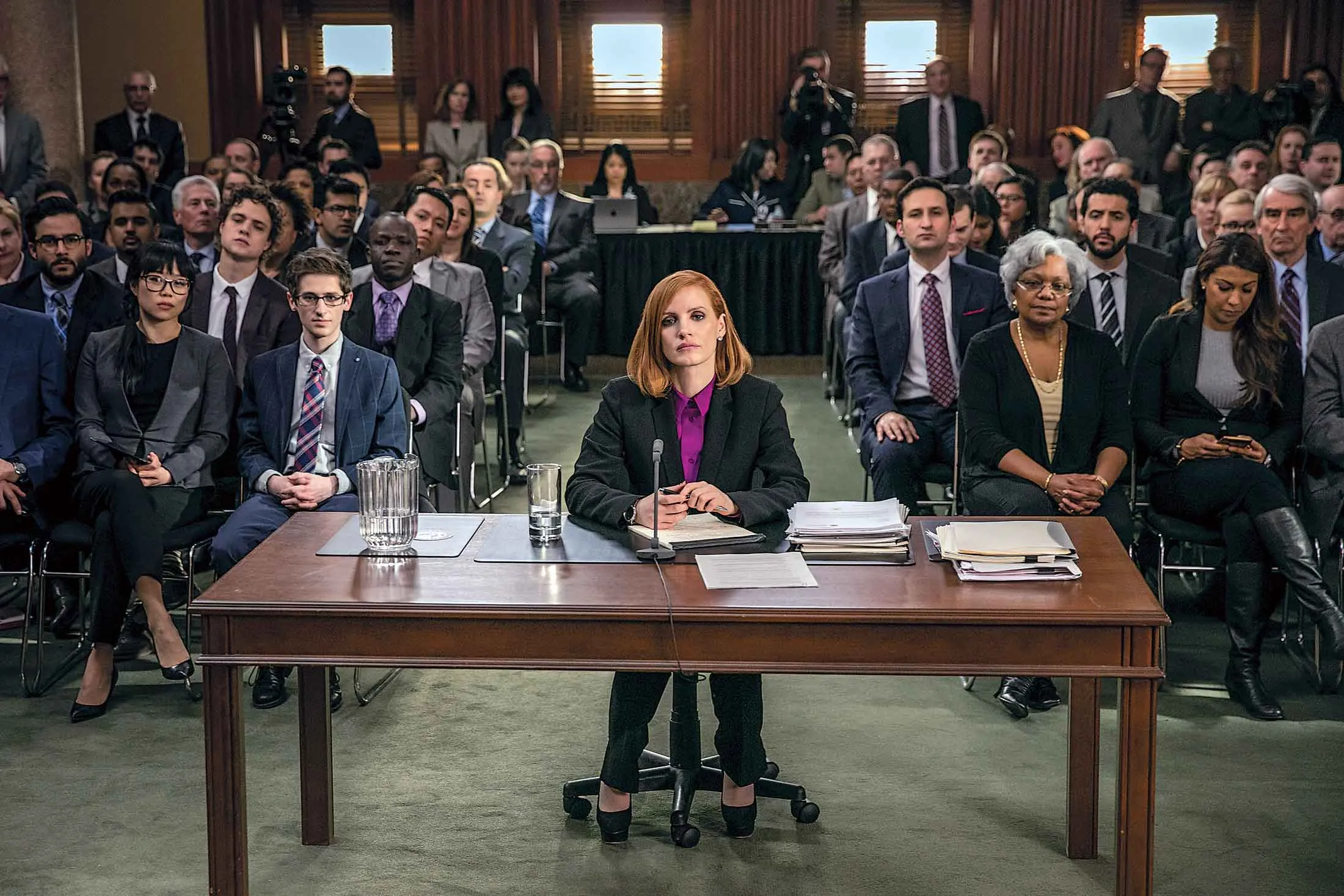 这很可惜,因为有很多值得喜欢的地方。查斯坦饰演的伊丽莎白·斯隆活力四射,她是一位失眠的工作狂和一流的强硬角色,属于那种学习所有规则以便更好地规避它们的不道德游说者。当她的老板(萨姆·沃特斯顿)招募她为第二修正案争取更多女性支持时(一个建议的口号:“上帝创造了女性;塞缪尔·科尔特让她们平等!”),她突然转变立场,加入一家竞争的游说公司,以确保希顿-哈里斯法案的通过,这是一项提议加强枪支管制的立法。