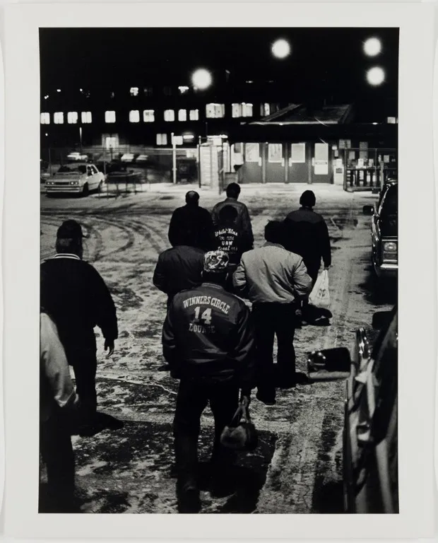 “夜班,庞蒂亚克组装厂,”1987年。拉斯·马歇尔/底特律艺术学院“在夜间工作的摄影师有时会浪漫化工业地平线,远处闪烁的城市灯光和工厂烟囱,”策展人在随附文本中写道。一些艺术家确实采取梦幻的方式:乔恩·德博尔的 西南底特律 让人想起爱德华·斯泰肯的 平铁大厦的照片,烟雾如炭笔般模糊,灯光闪烁着氛围。但其他人则采取明显不那么诗意的视角。在1987年,拉斯·马歇尔拍摄了一幅工人们在庞蒂亚克组装厂夜班前往的肖像,手插在口袋里,穿过满是轮胎印的雪地停车场。这里,夜晚感觉寒冷刺骨且令人疲惫。