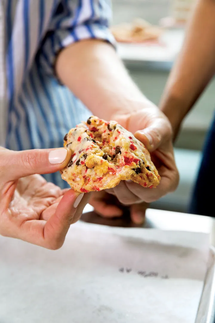 克里斯蒂娜·托西正盯着她在纽约布鲁克林的测试厨房里的一批样品饼干。她拿起一个,检查了一下,然后咬了一口这个红白相间的饼干。
